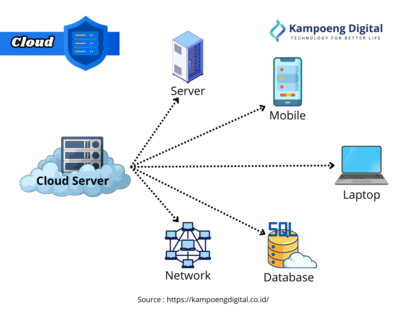 Cloud Server adalah server virtual yang berjalan di infrastruktur cloud dan dapat diakses melalui internet. Resource-nya fleksibel dan bisa disesuaikan kapan saja.