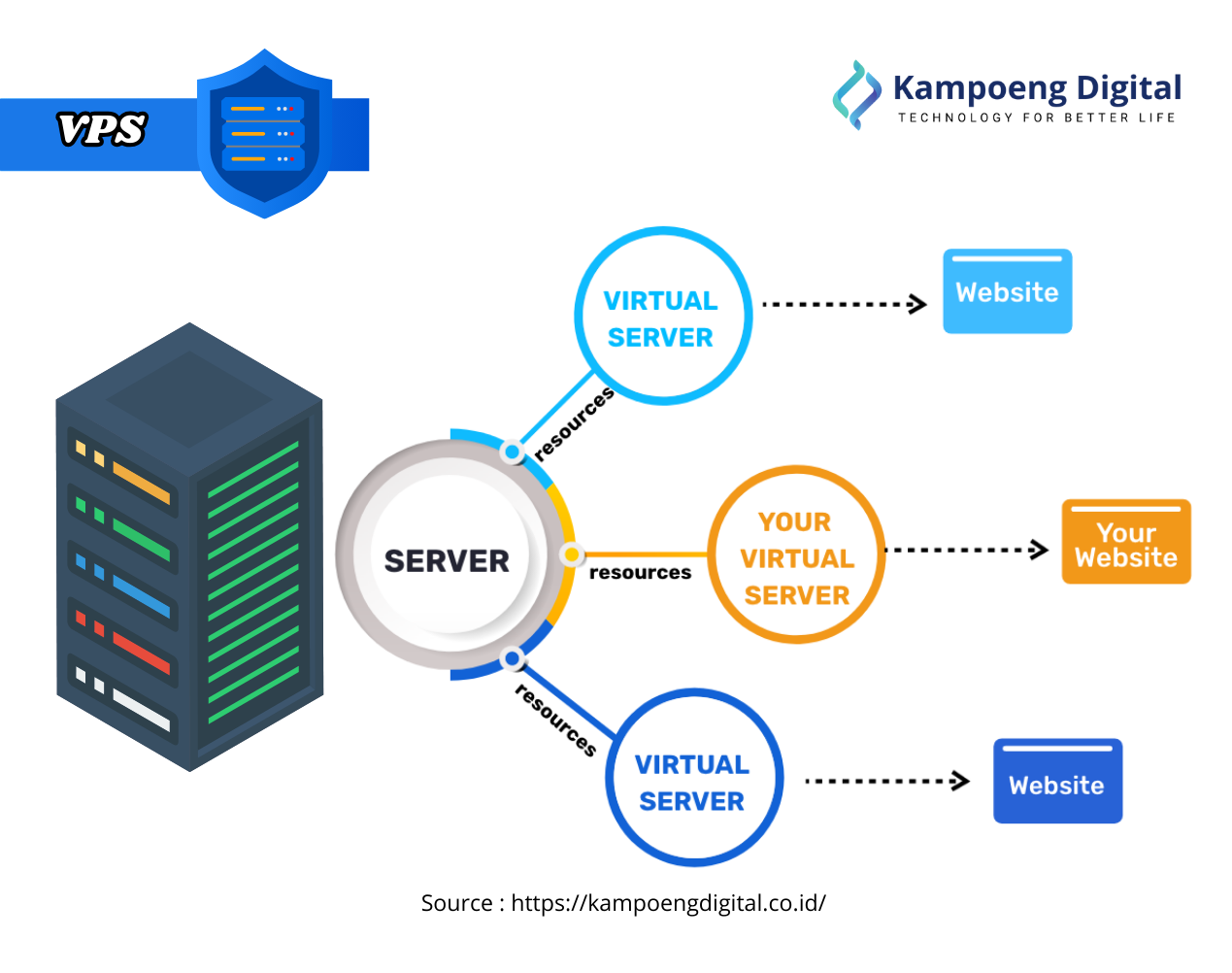 VPS adalah server virtual yang dibuat dari satu server fisik dengan resource terpisah (CPU, RAM, Storage).